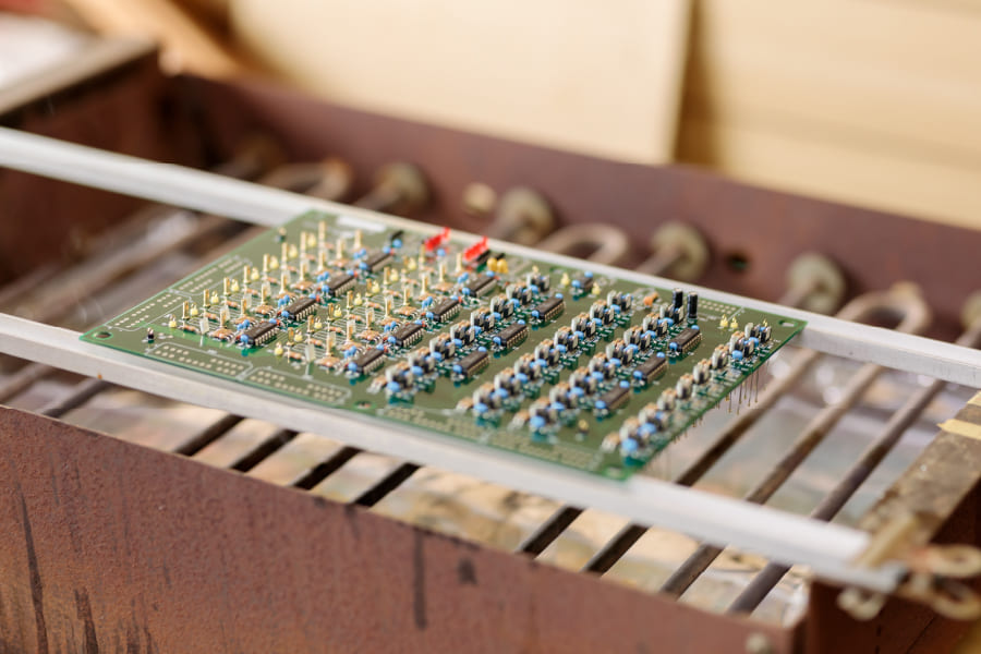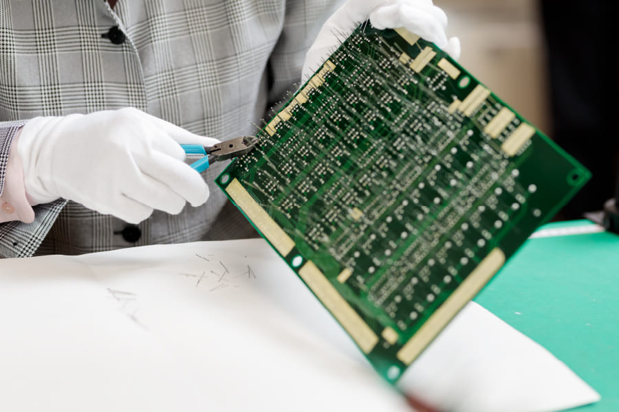 基盤一つひとつを機械の中に入れていくにあたり、基板同士の間隔を開けすぎても、狭すぎてもいけません。この間隔こそが長年の経験で培われる職人技です。