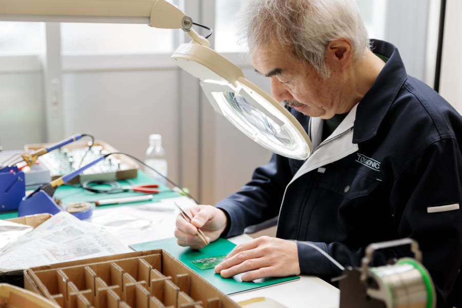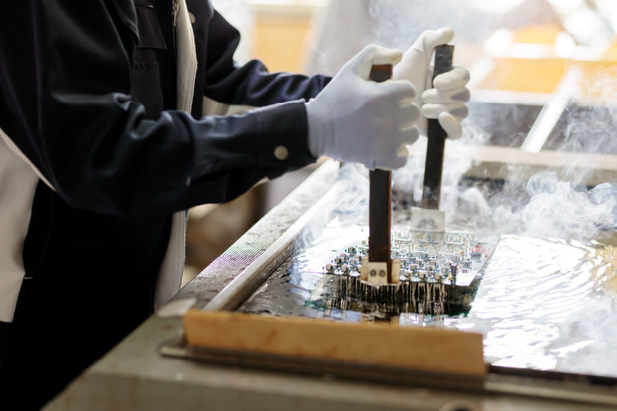 はんだ付け作業は、はんだ槽に付けすぎると基盤が全てだめになってしまうので加減が大切です。トヤソニックでは30年以上の経験を持つ職人が対応させていただきます。