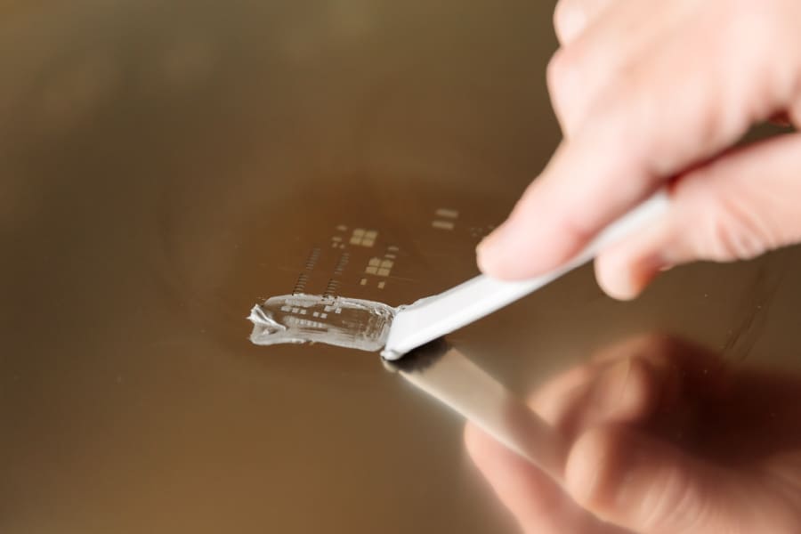 フラックスを塗布した後、熱で乾かします。