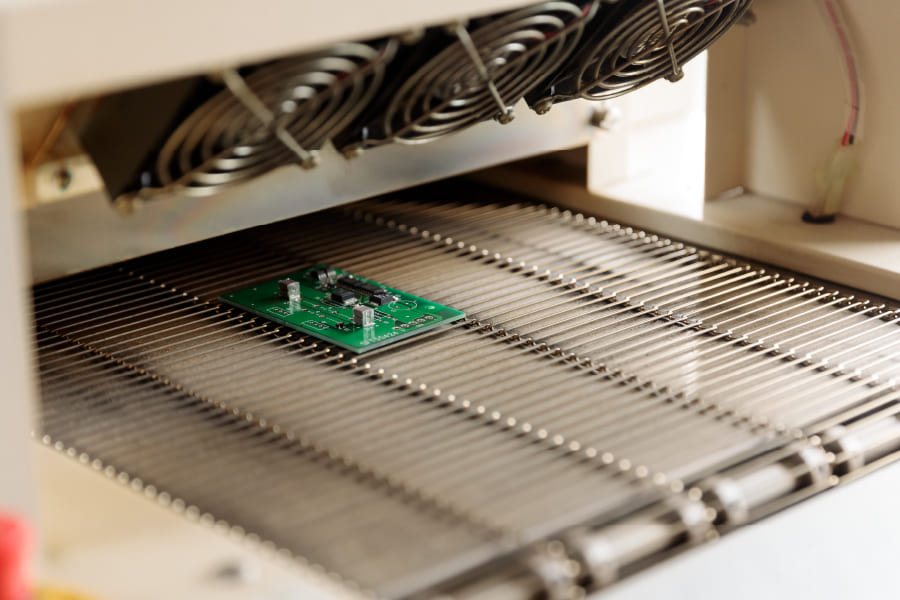 リフロー炉とは、クリームはんだを溶かし、しっかり基盤に部品を取り付ける装置です。